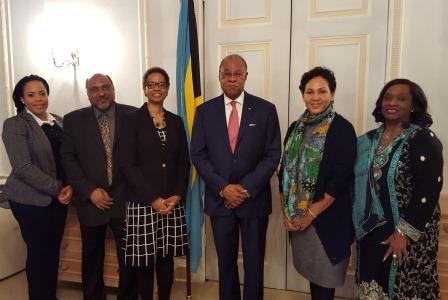 From left to right: Press Attache’, Miss Syann Thompson, Bahamas Liaison Officer to IMO, Mr Bernis Pinder, Deputy High Commissioner Miss Allison Booker, High Commissioner Bethel, Director of The Nature Conservancy, Mrs Eleanor Phillips and Financial Officer, Miss Chinita Khan.
